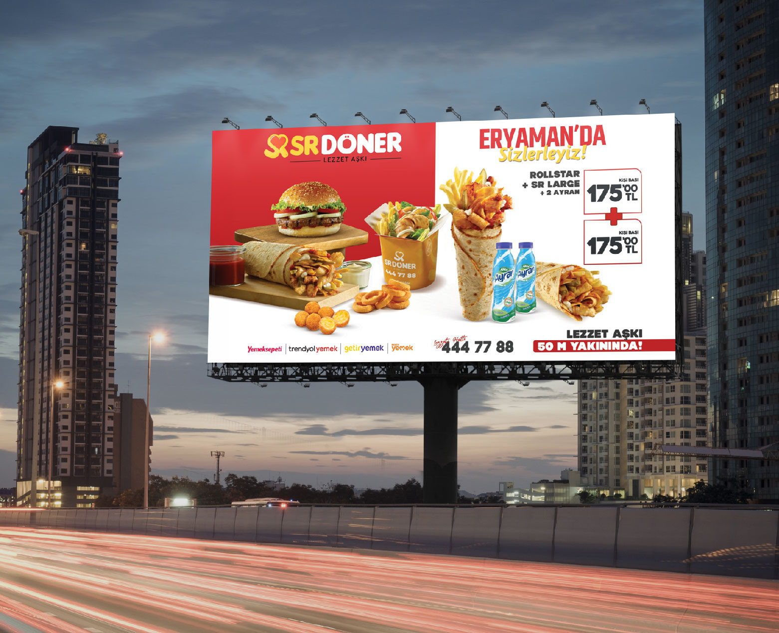 SR Döner, yıllardır değişmeyen özel sosları ve taze sebzelerle marine edilmiş eşsiz dönerleriyle karşınızda! Çarpıcı billboard tasarımımızla, lezzet tutkunlarının ilgisini çekiyoruz. Her lokmada damak çatlatan lezzet yelpazesiyle, SR Döner’in büyüleyici tadını doğrudan hedef kitleye ulaştırıyoruz. Lezzet aşkı sokaklarda!